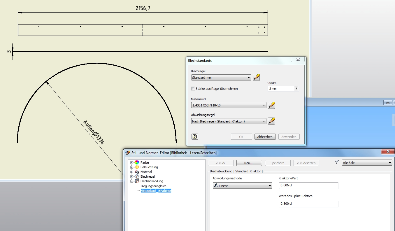 Guten Morgen, ich habe hier ein Rohrausschnitt mit folgenden Abmaßen: AußenØ= 1376 s= 3mm h= 100 Winkel= 180° Das Teil soll mittels 3-Walzen-Maschine gerundet werden. Ich habe keinen Erfahrungswert, welcher Korrekturfaktor hier eingestellt werden muss. --> Ich weiß, wir sind hier im Inventor-Forum, nicht in der Fertigungstechnik, aber ich meine schonmal hier gelesen zu haben, k-Faktor=0,5 passt in so einem Fall - aber ich finde den Beitrag nicht mehr und bin mir unsicher. Besten Dank im Voraus, 68er