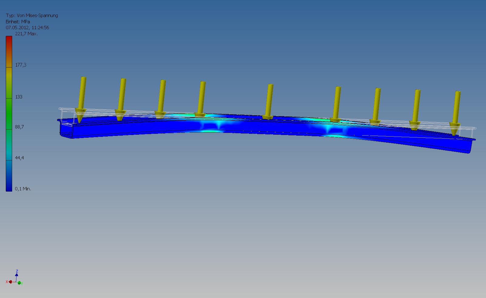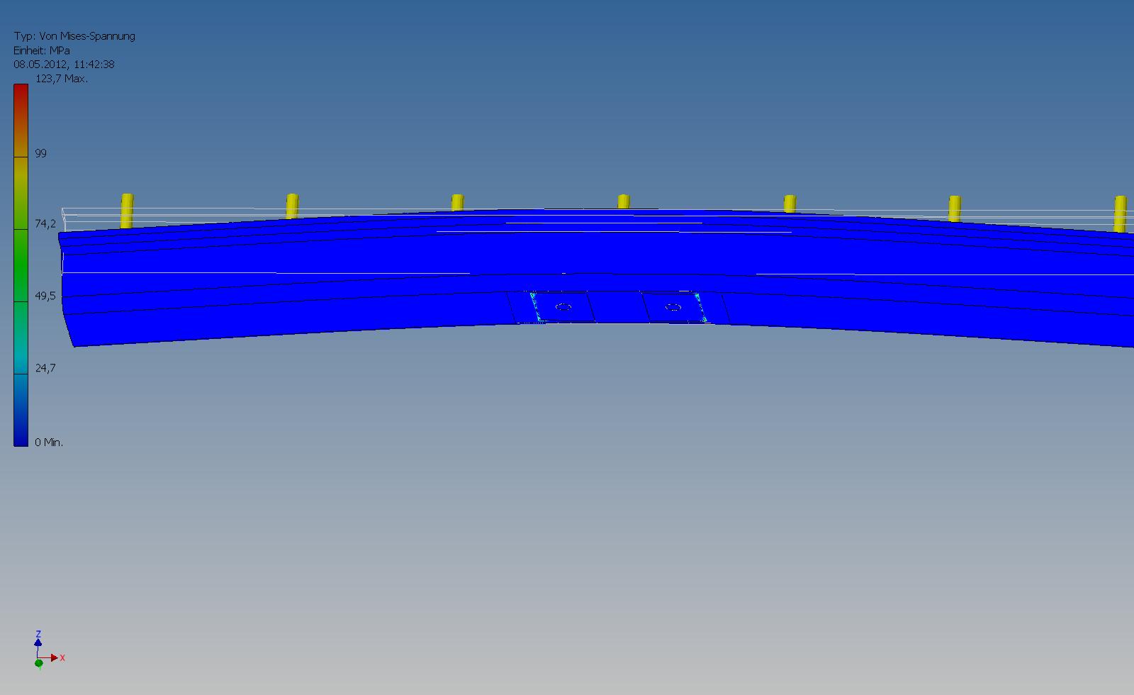 hi ulrix, habe ich getan und die lagérsituation ist folgende: ich habe unten am u profil zwei lagerstellen wie du schon richtig erkannt hast. die werte von den festpunkten sind folgende: fläche 1: x= -4830 N y= 0 z=1485 N fläche 2: x=4831 N y= 0 z= 1515 N ich habe auch noch mal ein bild reingestellt... also bringt mich das auch noch nicht so wirklich weiter... was sagtst du denn dazu das sich durch flächen die über trennen eingefügt wurden sich die spannungswerte ändern? habt ihr das auch ?? Eine Antwort auf diesen Beitrag verfassen (mit Zitat/Zitat des Beitrags) IP |