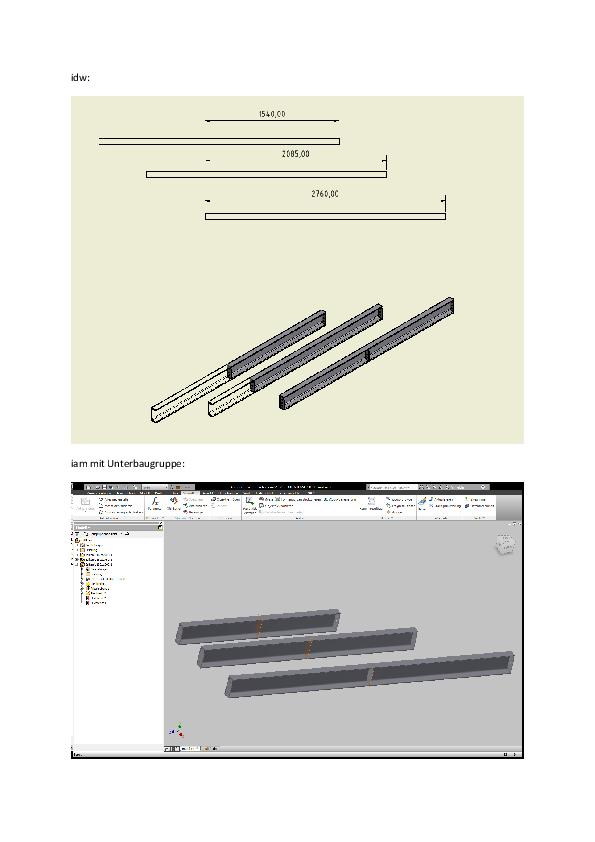 Hallo, erstmal vielen Dank für das Forum, hat mir schon häufig geholfen! Mein aktuelles Problem bekomm ich allerdings nicht mit der Suche in den Griff (wahrscheinlich falsche Schlagworte). Problem: In der Baugruppe werden alle Unterbaugruppen richtig angezeigt. Beim Erstellen der Zeichnung verändern sich allerdings die Bauteile, sobalt ich die Ansichten erstelle. Beschreibung: Ich habe eine Baugruppe erstellt. Ein U-Profil aus dem Inhaltscenter eingefügt und mit Kopfplatten versehen. Da ich mehrere Profile unterschiedlicher länge benötige, habe ich die BG unter anderem Namen gespeichert, das Profil in der Länge angepaßt und erneut gespeichert. Die 3 Unterschiedlichen Baugruppen (U-Profile mit Kopfplatte in unterschiedlichen Längen)habe ich in einer Gesamtbaugruppe relativ simpel verbaut. Nämlich über die Kopfplatten  Erstelle ich die Zeichnung (idw) von der Gesamtbaugruppe,werden alle drei Profile in der Selben länge angezeigt und dargestellt (Länge des ersten Profils was ich erstellt hatte). In der iam und Platzierungsvorschau für die Ansicht ist jedoch alles i.o. . Was vielleicht noch komisch ist, ist dass bei der schattierten Anzeige in der Zeichnung der Schatten (Die Angedeuteten Flächen) richtig sind, die Kanten aber weiterhin falsch liegen. Ich hoffe, dass jemand verstanden hat, was hier passiert und auch weiß wie man es behebt, bzw. wo mein Fehler liegt.