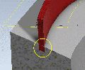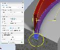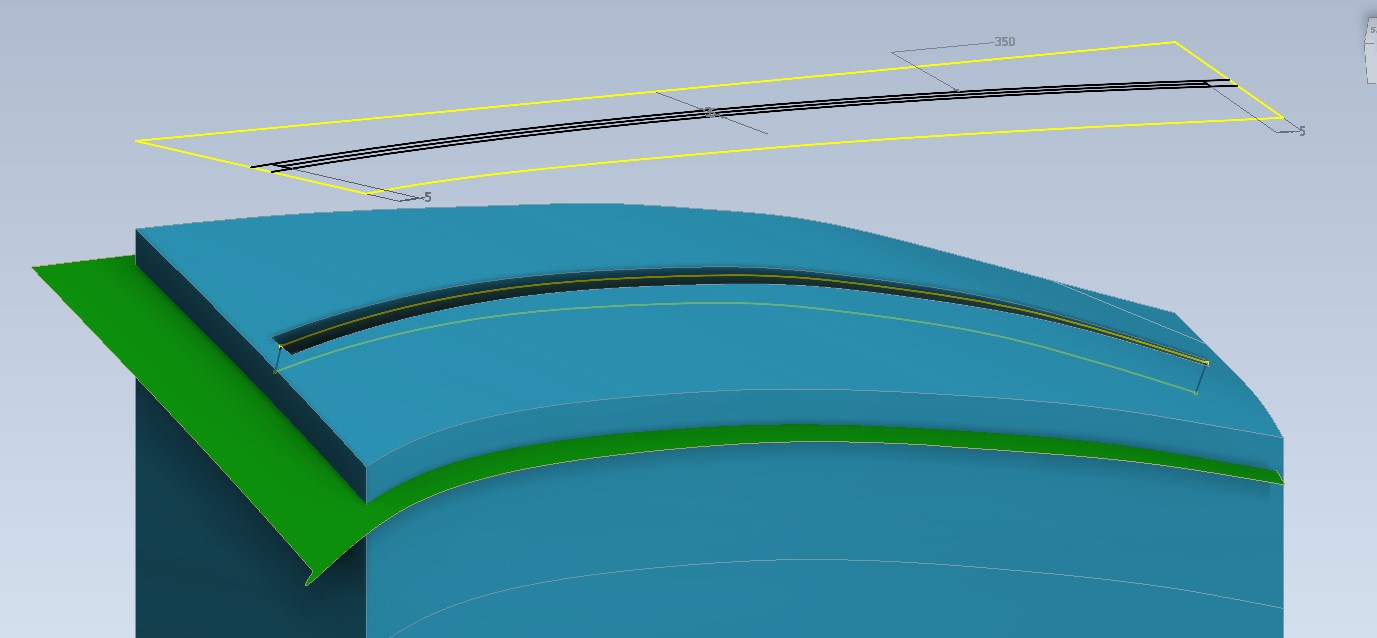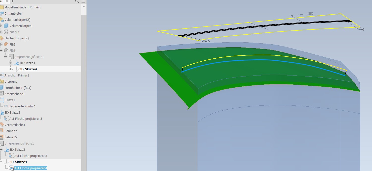 Oder du machst das so: Du projizierst die Mittelachse deiner Nut auf die verdrehte Fläche. Von dieser Fläche erstellst du eine um 6mm versetze Fläche nach unten. Auf diese Versatzfläche projizierst du dann die projizierte Mittelachse mit der Option " zum nächsten Punkt". das bedeutet, die 2. Kurve wird überall rechtwinklig zur Versatzfläche projiziert. Nun erstellst du eine Umgrenzungsfläche, die du nach rechts und links um 3mm aufdicken kannst. Da durch die verdrehte Fläche leichte Rundungsfehler entstehen, musst du hier auch nach oben ein klein wenig verdicken, sonst bleiben Flitterbereiche auf der Fläche stehen, wenn man die Nut nun durch kombinieren abzieht. Viele Grüße Roger Eine Antwort auf diesen Beitrag verfassen (mit Zitat/Zitat des Beitrags) IP |