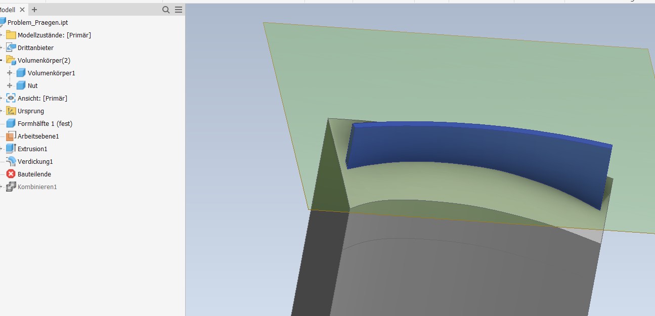 Moin, hab mal ein einen Teil der Trennfläche angehängt. Prägen an sich funktioniert, lediglich auf Fläche aufbringen, geht halt nicht. Mein Lösungsansatz ist jetzt der, dass ich die Fläche trenne und dann mit Verdickung / Versatz, die Nut darstelle. Für ein Feedback zum Problem, vorab besten Dank.