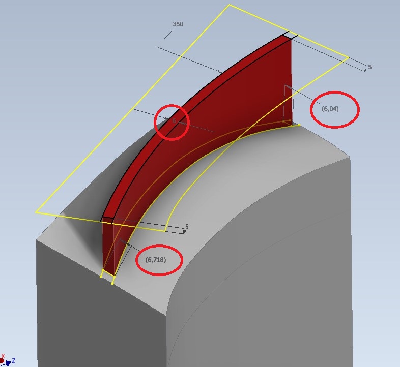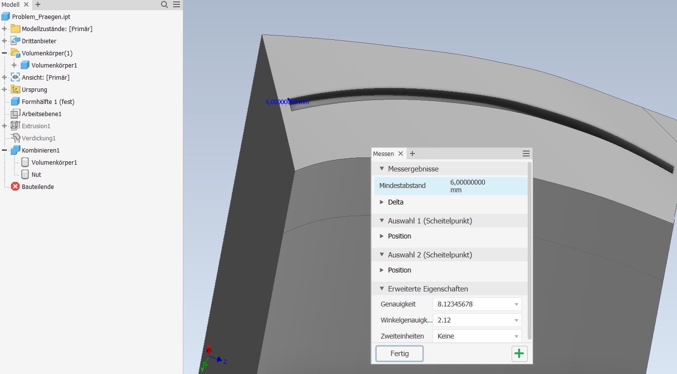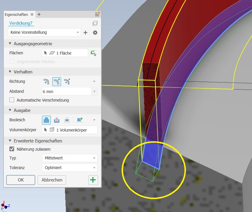 Ich vergaß zu erwähnen, dass es einen Unterschied macht, ob man beim Verdicken automatische Verschmelzung, oder Boolesch auswählt. Durch die unterschiedliche Schrägstellung der Fläche, ist jedoch dein ursprüngliches Maß 6 an jeder Stelle ein Anderes. Da müßtest du in deiner Skizze für die Nut etwas korrigieren. Viele Grüße Roger Eine Antwort auf diesen Beitrag verfassen (mit Zitat/Zitat des Beitrags) IP |