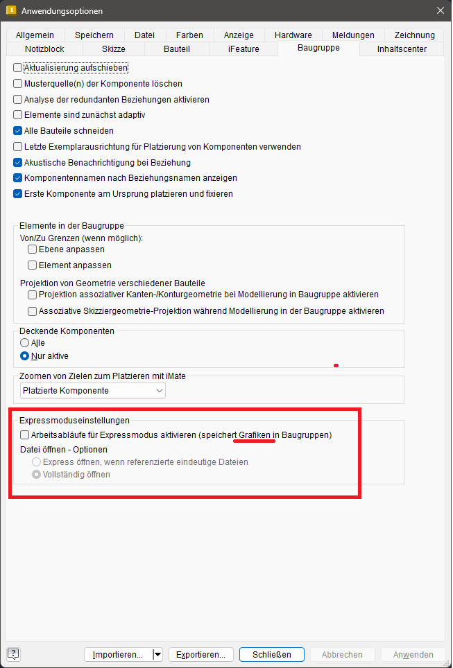 Hier im Job habe ich kaum Möglichkeiten, mein i7 (gen8) mit 32GB RAM kommt mit größeren Baugruppen mühelos zurande, (Quadro mit 5GB), IV2024 mit Profi-PDM (was nicht zwingend gut ist). Allerdings ist bei mir der Expressmodus wohl gleich deaktiviert, weil sowieso kaum schneller.