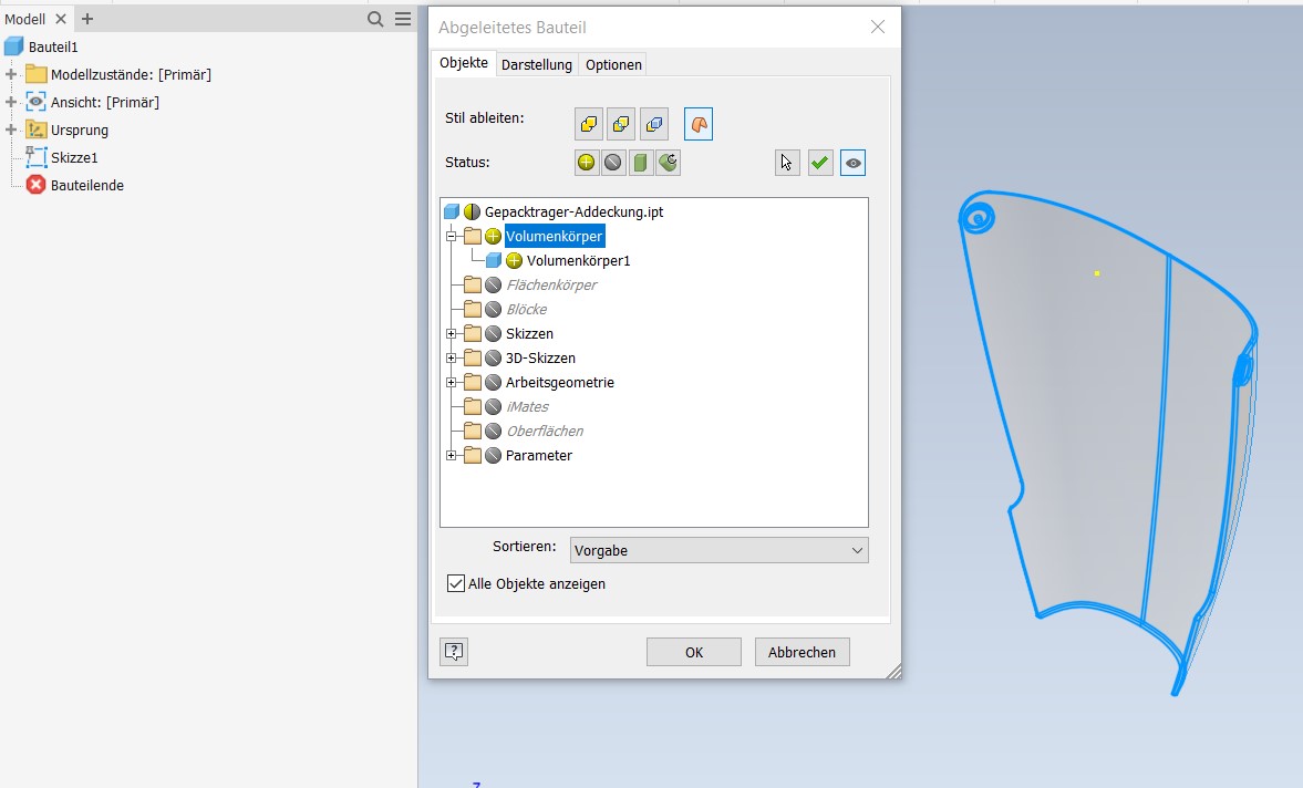 Ableiten tust du nicht von der "Masterdatei" aus, sondern du startest ein neues Bauteil, beendest deine Skizze, falls automatisch gestartet, und klickst auf den Ableiten Befehl. Nun suchst du, manchmal sehr mühsam, deine Datei, von der du was ableiten möchtest. Hatte am Anfang auch anders herum gedacht. Wäre meiner Ansicht nach auch einfacher und logisch, von einer geöffneten Datei Ableitungen zu erstellen. Aber nein, es ist anders herum. Viele Grüße Roger Eine Antwort auf diesen Beitrag verfassen (mit Zitat/Zitat des Beitrags) IP |