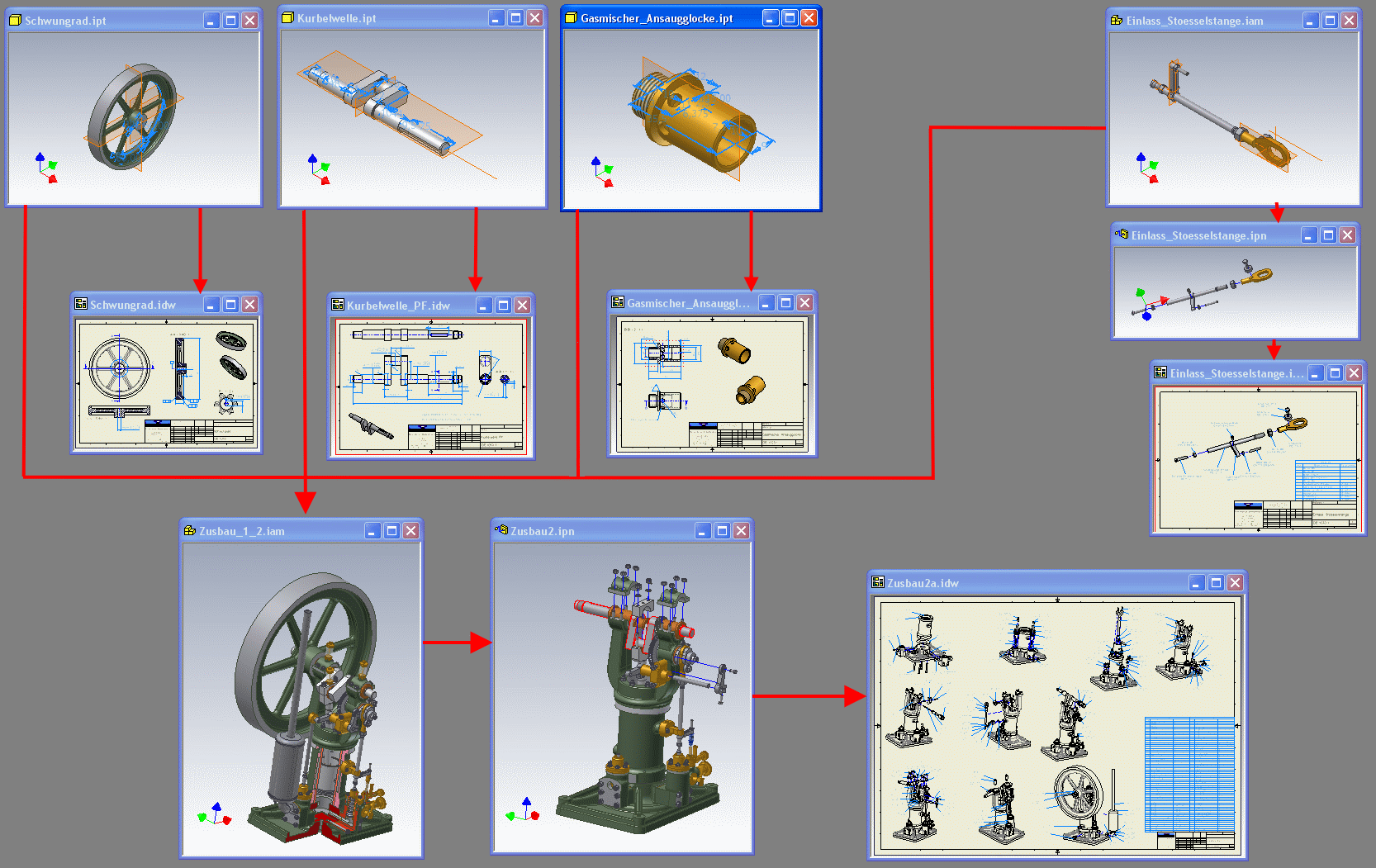 Anfangs hat man also die iam und startet die ipn. Dann genau anders herum werden zuerst die zuletzt montierten Teile vom Zusammenbau weggezogen und das meist als Verschiebekette, also Teile rausziehen, nächste Teile dazuwählen und alles zusammen weiter rausziehen. Wenn später die Abstände anders werden müssen, haben die Verschiebelinien Griffpunkte oder man ändert die Zahlenwerte.