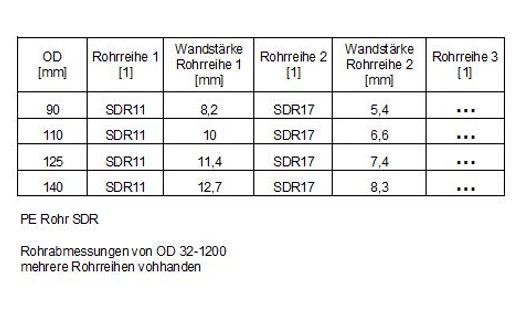 Moin Das könnte man vielleicht so lösen. Du erstellst einen Parameter "OD" mit mehreren Werten (90, 110, 125, usw.) und einen Parameter "SDR" mit mehreren Werten (1, 2, 3, usw.). Diese beiden Parameter ziehst du per Drag'n Drop in dein internes iLogic Formular. Stell bei beiden die Eigenschaft auf Pulldown oder Auswahlliste. Außerdem erstellst du noch einen numerischen Parameter "Wandstärke" mit der Einheit mm. Jetzt erzeugst du eine interne iLogicregel die etwa so aussehen sollte: Code: