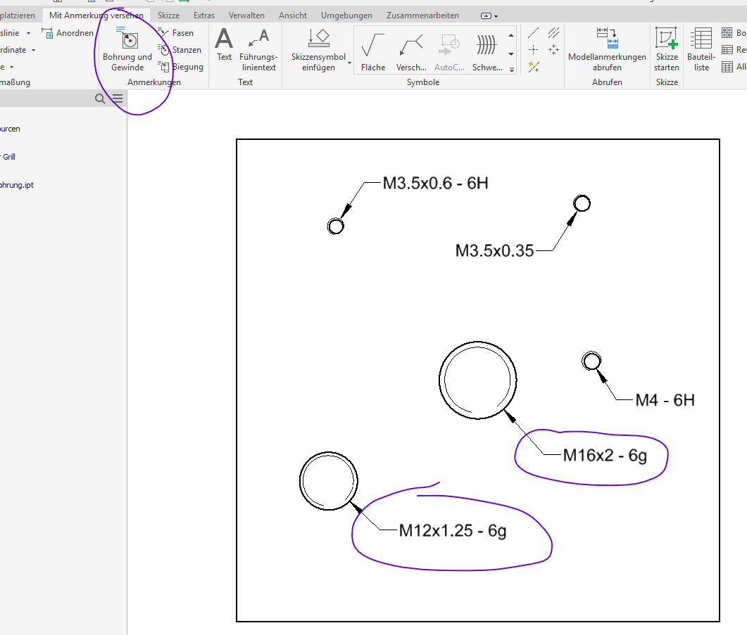 Hallo Achso, das mit dem Aussengewinde habe ich erst jetzt gesehen :-) Den Dialog bekommst du über --> Mit Anmerkungen versehen --> Bohrung und Gewinde Ich hab's mal schnell probiert: Bei Aussengewinde kannst du auch über diesen Dialog "bemassen", sieht dann so aus (M14 / M16 Gewinde). Ich habe aber die thread.xlsx für Aussengewinde nicht modifiziert Gruss
