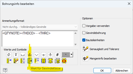Hallo zusammen, ich habe schon einige Beiträge im Forum gefunden, aber keine direkte Lösung. Es geht um die Bohrungs-/Gewindeinfo-Funktion in der Zeichnungsumgebung. Diese kann ich entweder auf "Benutzerdefinierte Vorgabe" oder auf Vorgabe stellen. Unsere Thread.XLS ist schon modifiziert, in dem bei Regelgewinden die Steigung weggelassen wird. Mein Ziel ist es, dass ich die benutzerdefinierte Gewindebezeichnung plus die Gewindeklasse anzeigen lassen kann. Wie kann man das einstellen? Aktuell zeigt es im Standard an: M5x0.8 - 6e oder bei "Benutzerdefinierte Vorgabe" nur M5, aber ohne Gewindelasse. Schön wäre M5 -6e Danke und Grüße MB-Ing. ------------------ Wissen ist Macht. Nichts wissen macht auch nichts  Eine Antwort auf diesen Beitrag verfassen (mit Zitat/Zitat des Beitrags) IP |