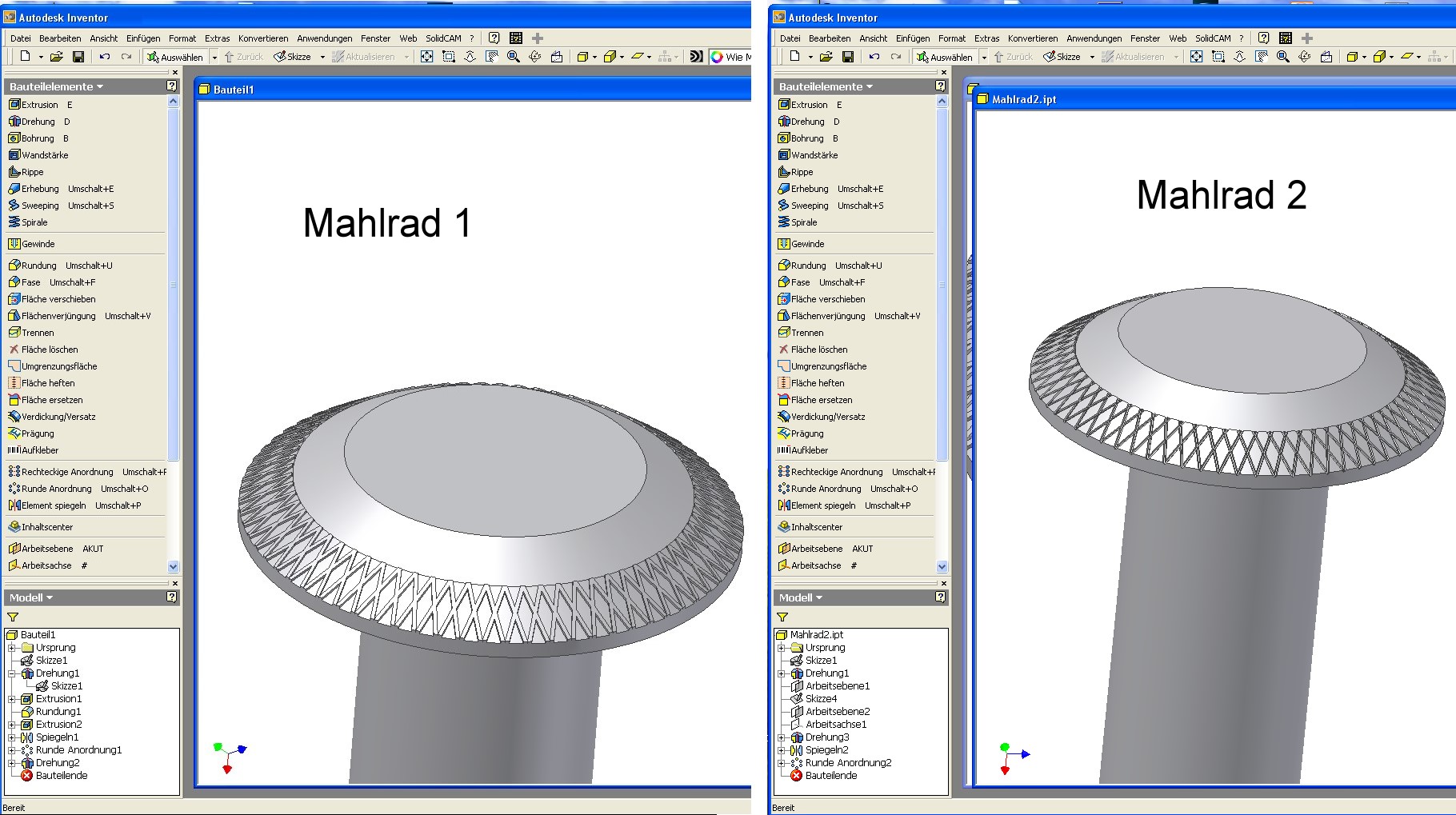 Hab‘s auch mal probiert, nur so aus Interessse. Die anderen Lösungen im Thema kann ich mir nicht ansehen, da im Job mein Win11 neuerdings die Dateidownloads nicht mehr kann. Ich kann man mir zwar das Symbol herunterladen, aber nicht die Datei. In der Fertigung kann einem sowas wie die Aufgabenstellung jederzeit passieren. Und nicht selten lassen die Konstrukteure das Ausmodellieren weg, das muß man dann selber machen. Die Aufgabenstellung läßt offen, ob die Profilierung nun erhaben sein soll oder in die Tiefe gehen kann. Zudem ist die Dicke nicht toleriert und vor allem nicht, ob die über die ganze Profillänge konstant sein muß. Sowas kann man ausnutzen. Anbei zwei Modelliervorschläge, gemacht mit einem nicht ganz neuen Inventor auf einem ebenso nicht fabrikneuen Dell Precision 490 mit 64GB Speicher, die XP aber nicht zur Gänze zu nutzen vermag. Einfach nur ein wenig Nostalgie. Im ersten Beispiel ist die Profilierung erhaben ausgeführt. Das würde man in der Praxis mit Kordeln machen, also ein Rad mit Gegenprofi und Druck dran abwälzen. Alternativ, wenn es nur um ein Teil geht, auch erodieren mit vierter Achse. Und – für größere Serien – ist denkbar, daß man Metallstaub sintert, d. h. Staub in die Gegenform, ordentlich drücken und dann backen. Die zweite Methode ist in der Fertigung wohl schneller als Inventor das rechnen kann. Hier schneiden wir das Profil in die Tiefe. Da nirgends steht, daß die Profillinien gerade sein müssen und über das Profil in der Tiefe aufs letzte Tausendstel gleich sein müssen, machen wir sie leicht bogenförmig. Und benutzen ein rotierendes, stirnseitig auf einer Messerscheibe angebrachtes Schlagmesser. Das Schlagmesser habe ich hier mal auf einer rund 120mm großen Scheibe montiert, die können wir also mit Auswuchtung problemlos mit 3000U/min laufen lassen. Die Profilierung hat 70 Einkerbungen, das Werkstück rotiert also mit exakt 3000/70 U/min, mit jeder Umdrehung des Schlagmessers schneidet dies also eine der Kerben. Wichtig ist der exakte Synchronlauf. Da reicht ein Schnitt bei den Tiefen und Breiten. Nun können wir noch die Drehrichtungen so einrichten, daß sich der Radius des Schlagmesserflugkreises nicht als Verstärkung der Ausbauchung des Bogens auswirkt, sondern dagegen läuft. Das Ganze ist also für Werkstück und Schlagmesserscheibe in kontinuierlicher Vorgang, ähnlich dem Wälzfräsen. Ist die eine Seite fertig, schwenken wir das Schlagmesser mitsamt Scheibe für die andere Seite. Für jede Seite des Musters braucht die Maschine etwa 1.5 Sekunden. Plus Schwenken ca. 5 Sekunden. Das heisst, das Muster ist in gut 10 Sekunden drin. Wichtig ist eben nur, daß die Maschine Werkstück und Werkzeug synchron drehen kann, das ging beim Mehrkantschlagen (z. B. Fünfkantschrauben) aber vor 100 Jahren schon. Es kommt halt auch drauf an, ob man nur eins oder zehn macht oder zigtausende. Und woraus.