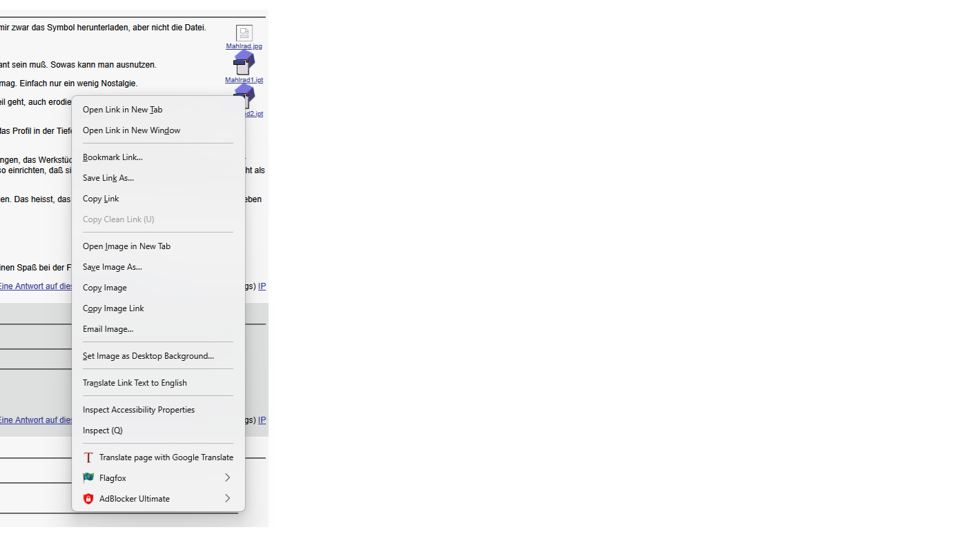 Danke. "Save Image as" sichert mir das Symbol, das man auf CAD.DE neben dem Beitrag sieht, aber nicht die dahinter stehende Datei. Die wiederum würde "Save target as" oder so ähnlich speichern. Der Browser ist Firefox, den hab ich zuhause unter Linux auch und da klappt es, denn da gibt es das "Ziel speichern unter".