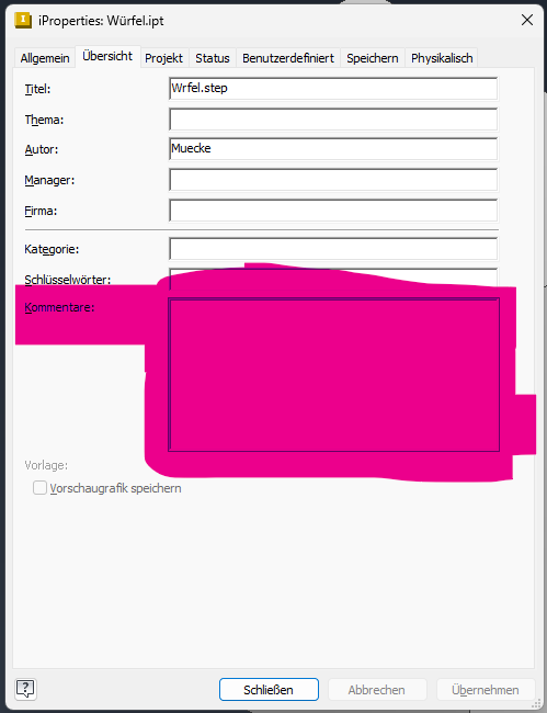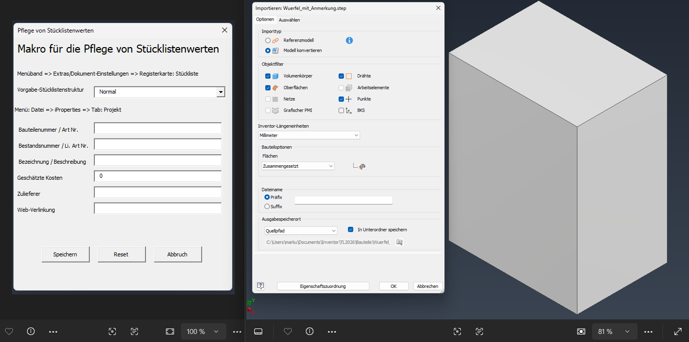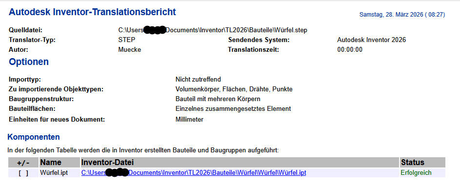 Servus, Hmm, OK diser "Translationsbericht" kann nicht mit zusätzlichen Infos gefüttert werden? Wie z.B. - Bauteilnummer / Art.Nr. - Bestandsnummer / Li. Art.Nr. - Bezeichnung / Beschreibung - Geschätzte Kosten - Zuleferer - Web-Verknüpfung Denn diese sachen versuche ich immer auszufüllen, doch wenn ich ein STEP Datei draus amhe sind die sachen alle weg :-( was isch schade finden. Daher hatte ich gehoft das bei den Dritanbiter Daten es irgend wie integrirt werrden könnte. habe ein Muster STEP (Würfel.step) erstellt. da schaut die Datei dann bei mri so aus. (Bild) @rkauskh Was meinst du mit "iProp Beschreibung" ich habe das Feld (Bild) Kommentare gefunden, doch das wird leider aus der IPT nicht mit in die STEP übernommen :-(