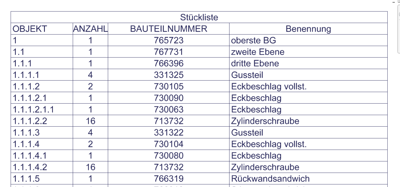 Moin Lies deinen Beitrag bitte mal selbst und versuche den zweiten Satz zu verstehen. Mir ist es nicht gelungen. Keiner von uns kennt euer PDM bzw. dessen Nummerierungsschema. Wir wissen also nicht wie dieses aussieht und wir verstehen nicht warum dieses die Positionsnummern der Unterbaugruppe benötigt. Was zeigt der Screenshot? Die normale Nummerierung von Inventor oder das Ziel? Wie sieht denn die Zielnummerierung aus? Grundsätzlich wäre es möglich die Positionsnummern der Stückliste zu überschreiben. Entweder von Hand oder mit Makro. Das wäre aber statisch, sprich muss bei jeder Änderung geprüft/aktualisiert werden. Da steckt schon ein enormes Katastrophenpotential drin. Die Überschreibungen werden nur in der jeweiligen Baugruppe gespeichert. Sprich, in einer Unterbaugruppe sieht man davon nichts. Verbaut man die "überschriebene" Baugruppe in eine andere Baugruppe sieht man davon nichts.