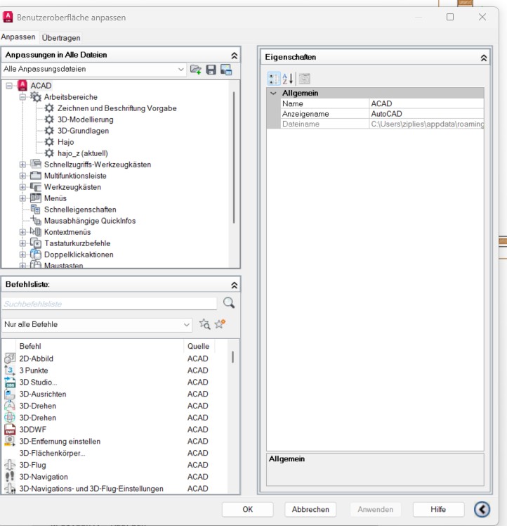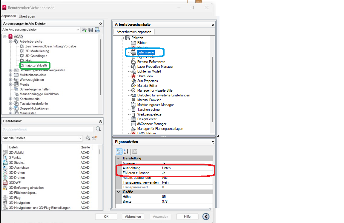 GRÜN 2. Befehl: ABI, markiere/wähle oben links den Arbeitsbereich [also draufklicken, der Eintrtag wird dann markiert], im rechten aufgeklappten Bereich des Dialoges sollte der Abschnitt "Arbeitsbereichinhalte" erscheinen BLAU 3. Punkt PALETTEN aufklappen, BEFEHLSZEILE markieren, ROT unten rechts AUSRICHTUNG = UNTEN wählen und FIXIEREN ZULASSEN = JA, den Dialog über [OK] verlassen.