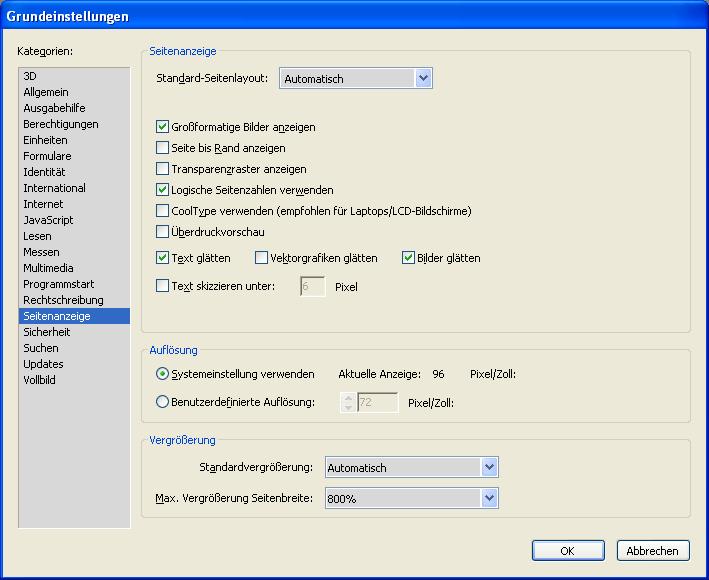 ich hatte vor eniger Zeit auch Streifen in der Anzeige von PDFs, die als Solid-Schraffuren erstellt waren. Nach längerer Suche war eine Reduzierung der Streifen möglich, in dem ich mit den Grundeinstellungen glätten in Adobe Reader gespielt habe. Meine aktuellen Grundeinstellungen (Bearbeiten/Grundeinstellungen) im Adobe Reader 7 siehst Du in der Anlage. Vielleicht bringt es auch bei Dir Verbessungen. Gruß Bernd Eine Antwort auf diesen Beitrag verfassen (mit Zitat/Zitat des Beitrags) IP |