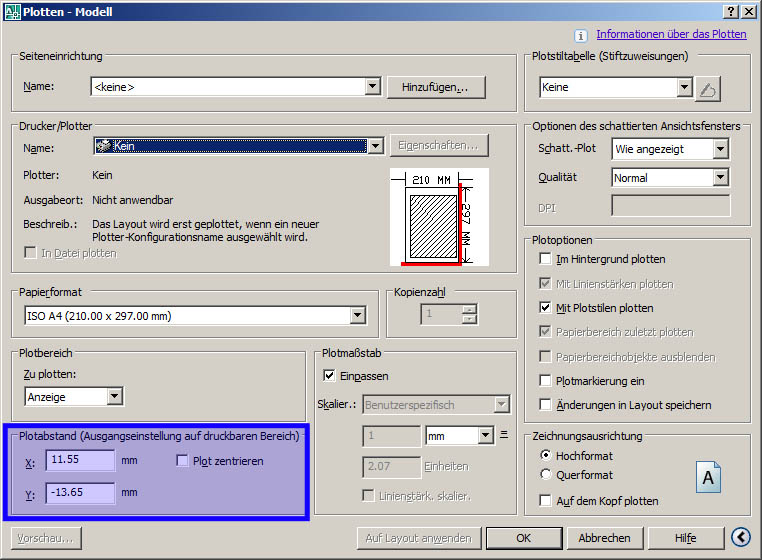 Hallo Alfred, ich habe den Plotter HP850c. Die aktuelle Zeichnung soll im Format DIN-A0 geplottet werden. Das muss passen. Seitlich fehlen nach dem Ausdruck dabei immer ca. 2 cm. Ich drucke aus dem Layout heraus. Wo kann ich die Einstellung für den Versatz ändern? Ich arbeite mit AutoCAD 2007. ------------------ Gruß cadsemore Eine Antwort auf diesen Beitrag verfassen (mit Zitat/Zitat des Beitrags) IP |