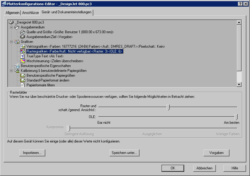 mit DHL nein - über Netzwerk zum Server und dann zum Plotter. Ich habe noch mal geschaut und ich vermute es liegt daran das beim Drucker die Rastergrafik ist aktiviert werden kann. Bei Raster 6 und OLE 6 geht es und ich habe nur Raster 3 und OLE 6. Wenn ich mit einem HP 750c eine *.plt erstelle sieht alles supi aus. Dort sind dann aber nicht unsere Papierformate verfügbar. Die *.pmp vom 800 nimmt der 750 nicht. ------------------ Eine Antwort auf diesen Beitrag verfassen (mit Zitat/Zitat des Beitrags) IP |