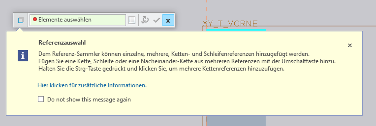 Wie werde ich die Infofenster (kommen z.B. bei Projizieren und Versatz im Skizzierer) dauerhaft los? Ich kann zwar den Haken bei "Do not show...) setzen, aber das gilt nur für die aktuelle Sitzung. Nach einem Creo-Neustart kommt die Meldung leider wieder. Ich dachte eigentlich, dass die Auswahl im Benutzerprofil abgelegt wird und so dauerhaft hält.