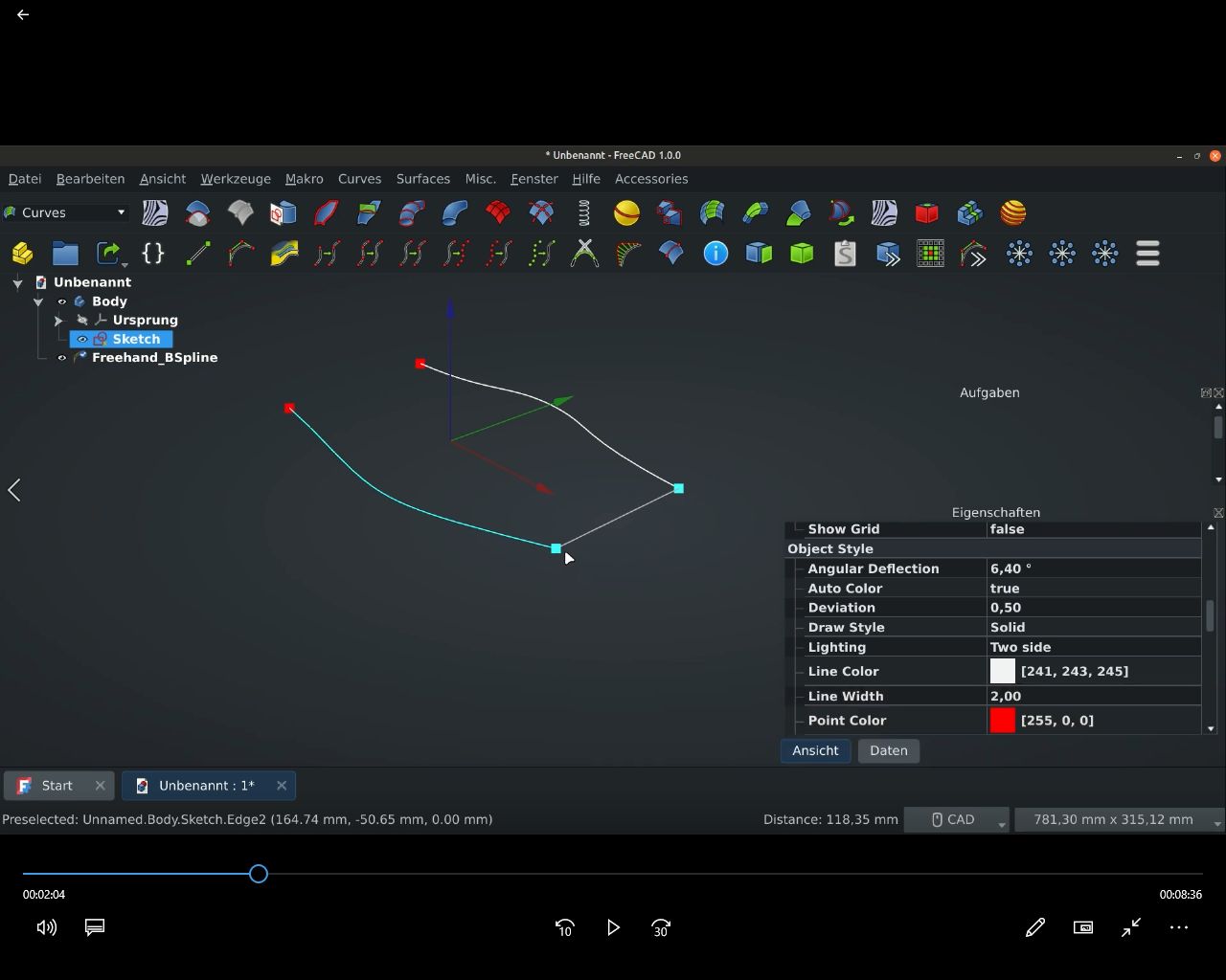 Da lässt sich nichts verbiegen, da der Spline nur zwei Punkte hat. Ich habe im Video (und in der Datei) einen weiteren hinzugefügt ("i"-Taste). HTH, Ralf ...flüssig, kann ich noch nichts sagen. Das Programm ist im Moment noch schneller als ich  Ich bin dabei einzelne Schritte zu erlernen, wenn ich sie brauche. Da sind so viele Fenster und Daten sichtbar...und soviel Menüpunkte und Einstellmöglichkeiten auf einmal. Bei SolidWorks bin ich ziemlich früh dabei gewesen und da hatte das Programm nur "wenige" Funktionen. Ich bin mit den "neuen" Funktionen mitgewachsen. Deshalb arbeite ich mit meiner SolidWorks 2010 Lizenz wahrscheinlich immer noch am liebsten. 1. Ich bin mit AutoCAD (ich glaub 9.0 - so 'ne gehackte Version mit emuliertem Co-Prozessor) an der Hochschule "aufgewachsen" 2. ME10 an der Hochschule 3. Dann kam AutoCAD Light (das war eine Windows Version - 2 Jahre) 3. AutoCad 12 mit ersten Versuchen 3D Drahtmodellierung (3 Monate) 4. ME10 und SolidDesigner (2 Jahre) 5. SolidWorks (28 Jahre) 6. FreeCAD (wenige Stunden) ------------------